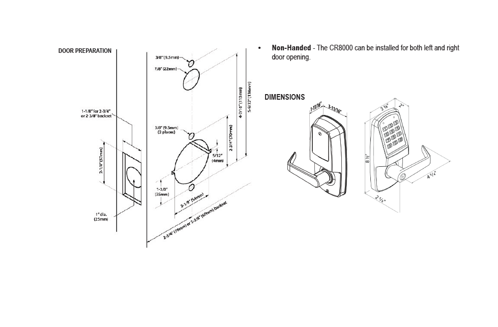 Installation and Compatibility Designed for easy installation, the CR8000 keypad door lock is non-handed and reversible to fit left- or right-opening doors. It fits standard door preparations and supports multiple backset options (standard 2 3/4" with others available). The lock operates on 4 AA batteries (included) with a 2-year warranty for added peace of mind.